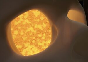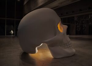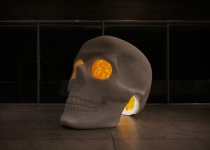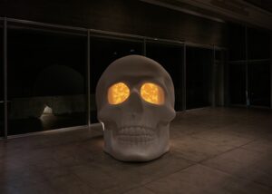 高さ2メートルのガイコツ型立体《マリー》は、白く削り出された外側と、死者の日を思わせるマリーゴールド色の内部をもつ参加型アート作品です。子どもは中へ入り、大人は目の穴から覗き込みながら、来場者は花紙で花をつくり、一輪ずつ内部に飾っていきます。花が増える過程は祈りと祝祭を映し出し、生と死の循環を示します。会期を通じてその姿は静かに変化し、空洞はやがて人々の思いや記憶が重なり合う場となります。本作は、臼杵市出身のアーティスト・佐藤雅晴(1973-2019)の遺作《ガイコツ》との出会いや、作家が父の病と向き合った時間を背景に生まれました。ぜひ会場で花をつくり、《マリー》の物語に参加してください。
